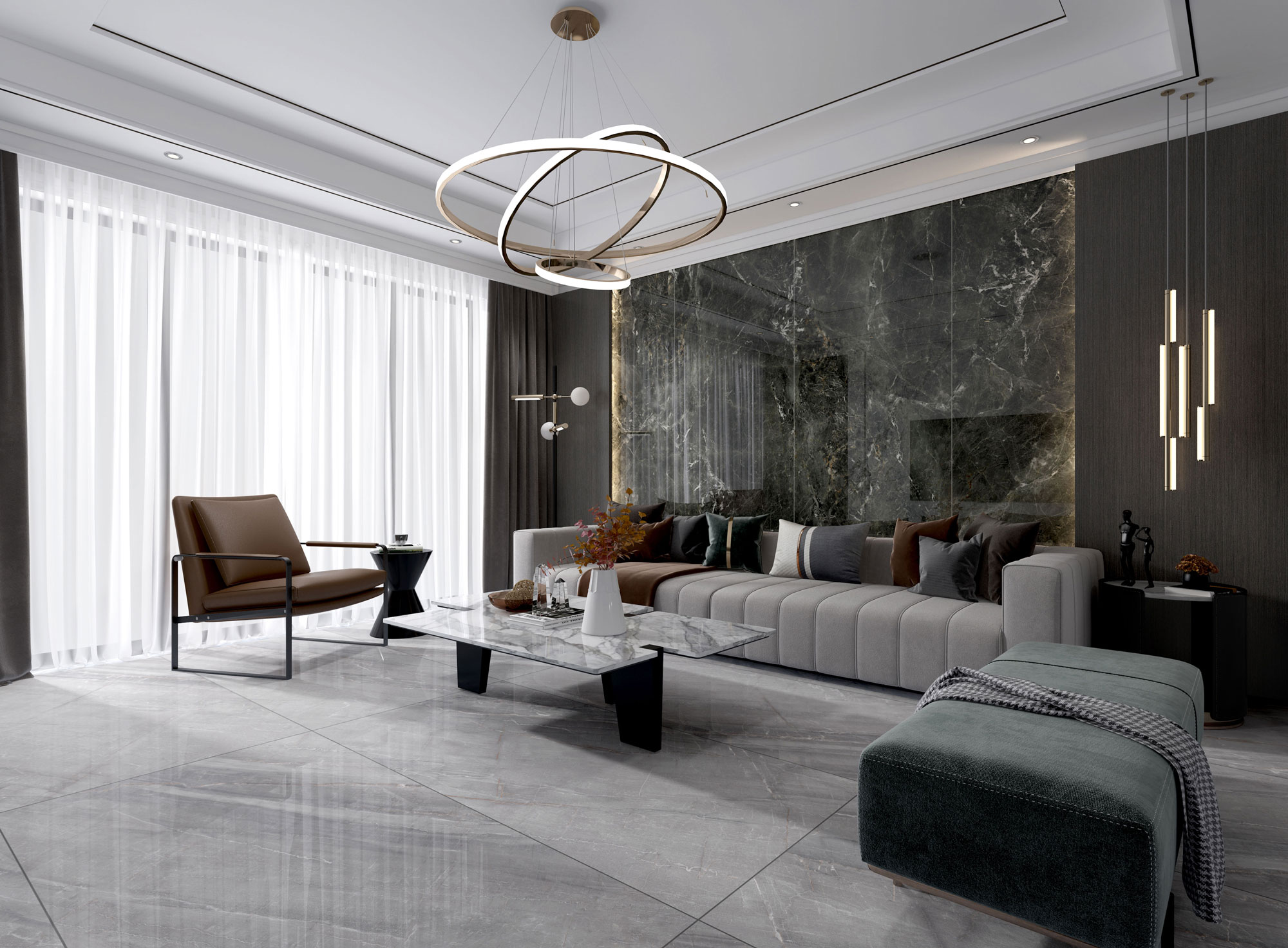 設計藍本源自意大利范特西石材藝術,大塊的寫意灰,又有細節的勾勒與刻畫,演繹時尚家居藝術風。